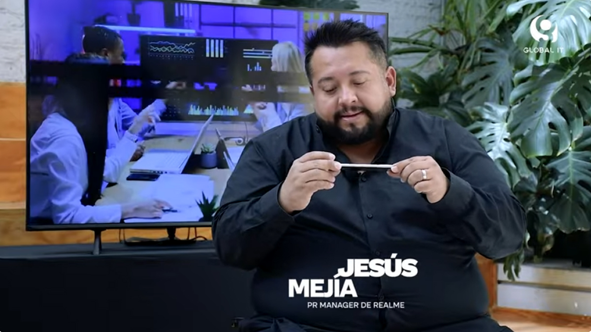 Jesús Mejía, PR Manager de Realme México, presenta el innovador realme 14 Pro en Global IT Media, destacando sus avances tecnológicos únicos.